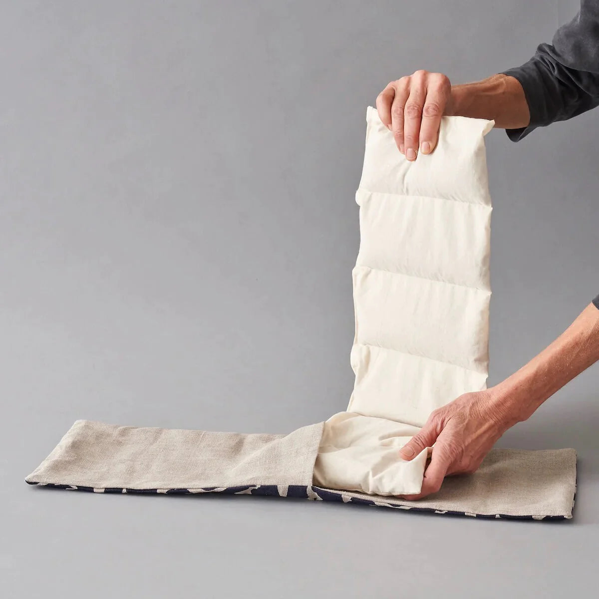 A long and comforting wheat bag that moulds to the shape of your body like a warm hug.