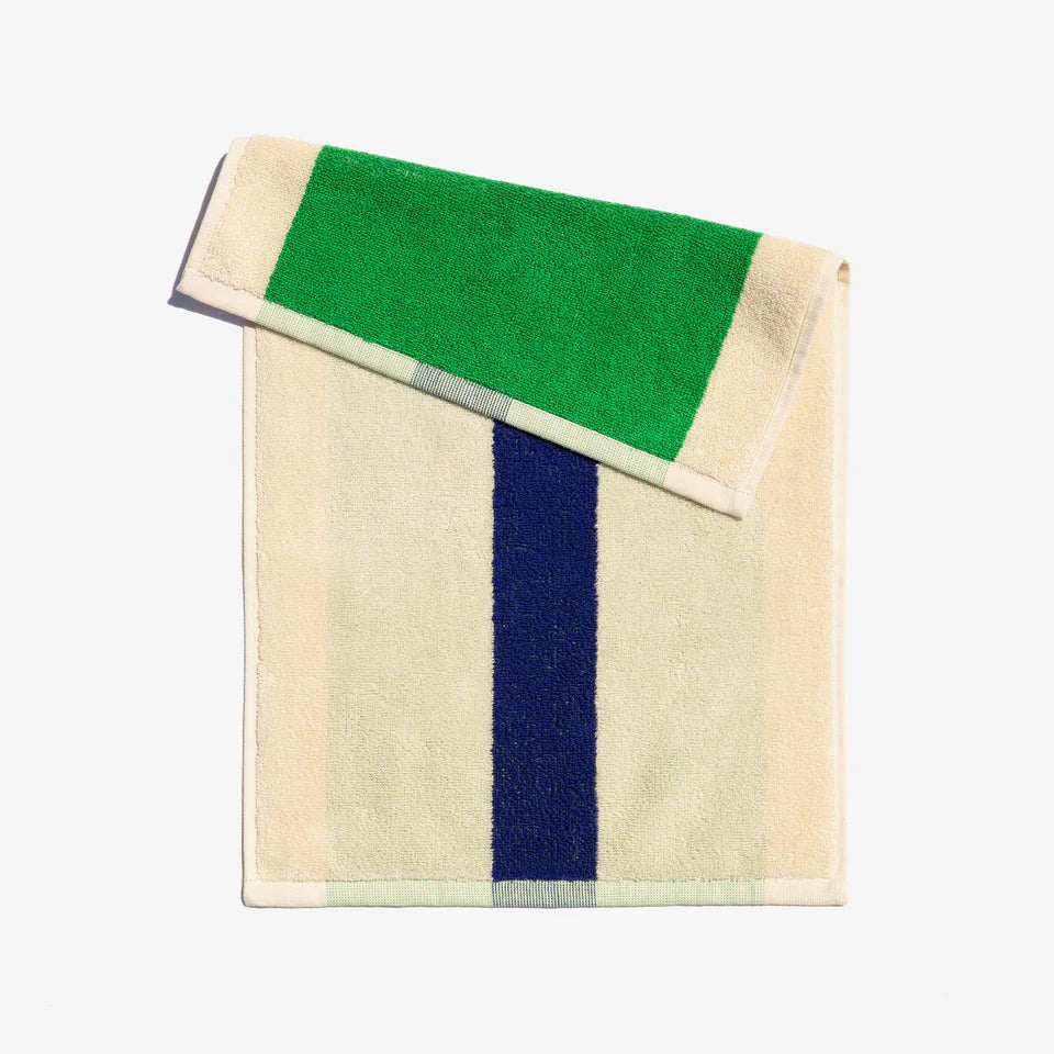 Double sided towel with a different coloured block or stripe on each side and a handy hanging loop.