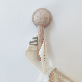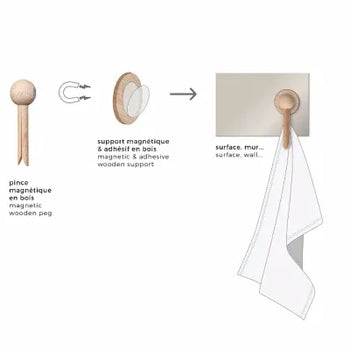 This handy peg comes in two parts - the peg part contains a small magnet and attaches to your towel, the other magnet is hidden within the neat wooden fixing which can be attached to the wall or a cupboard door, using the pre-applied adhesive.