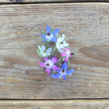 Borage (Borago officinalis) also known as Starflower, is an edible ornamental and medical plant. Mood lifting and pretty, these flowers can be added to salads or cocktails!