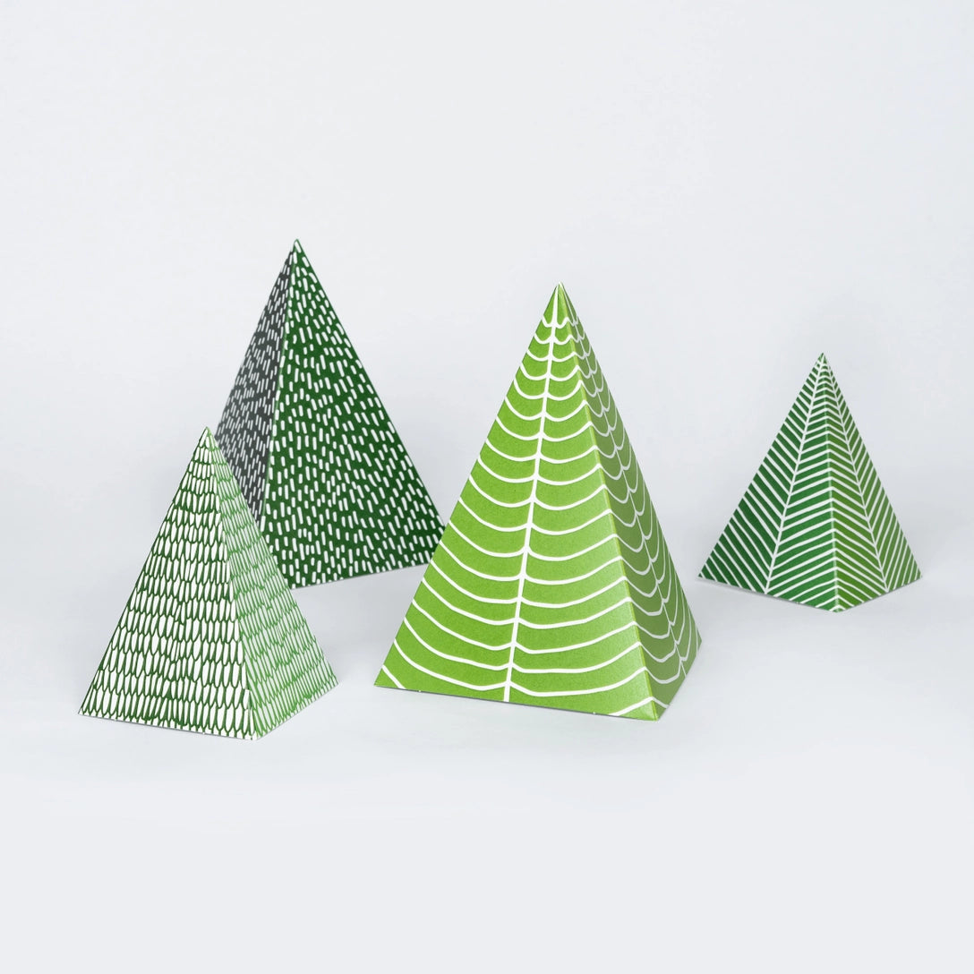 4 Cards all together: 2 larger trees and 2 smaller ones. Shades of green on each face and 4 different patterns.