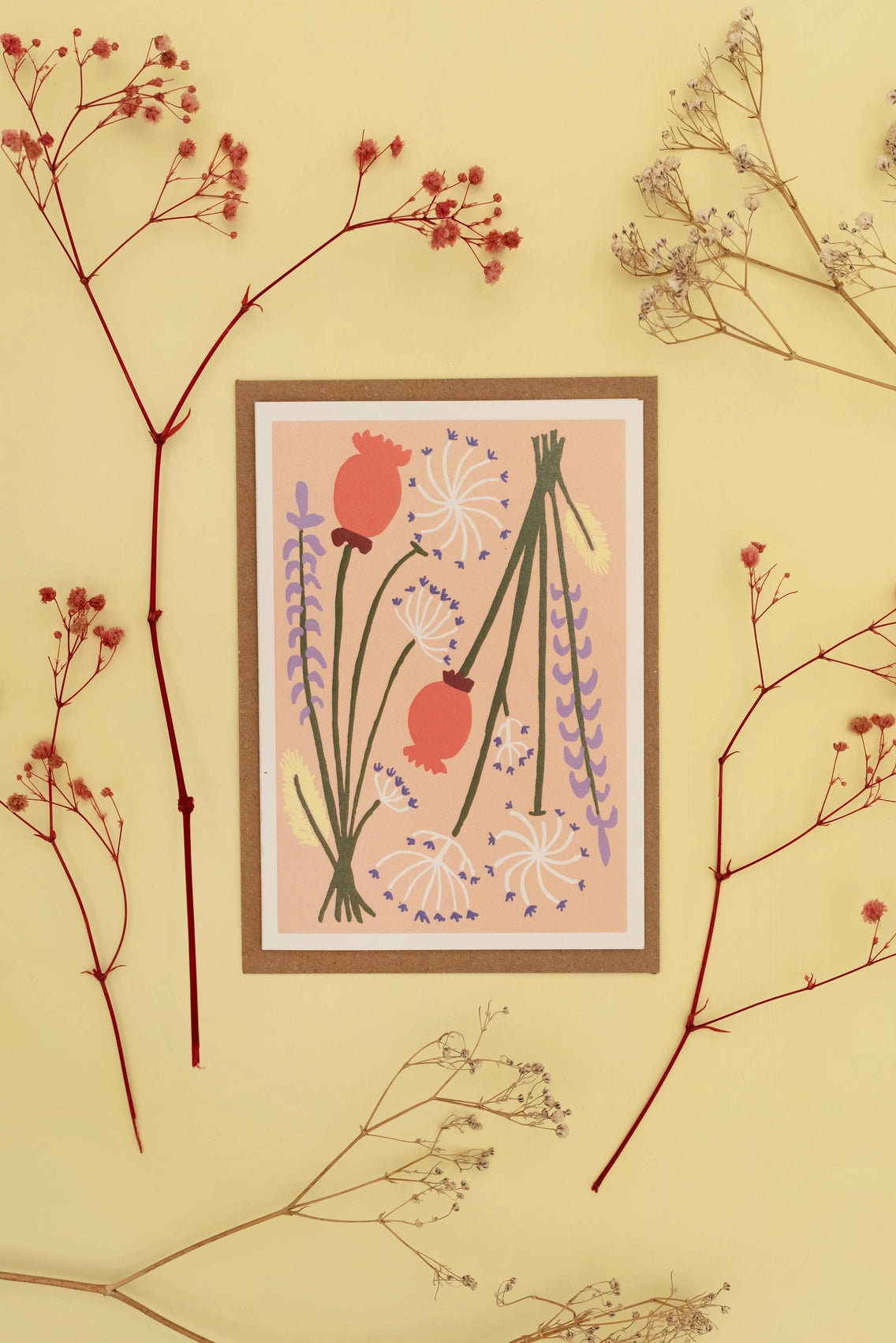 Striking greetings card inspired by the aesthetics and colours of dried flowers.