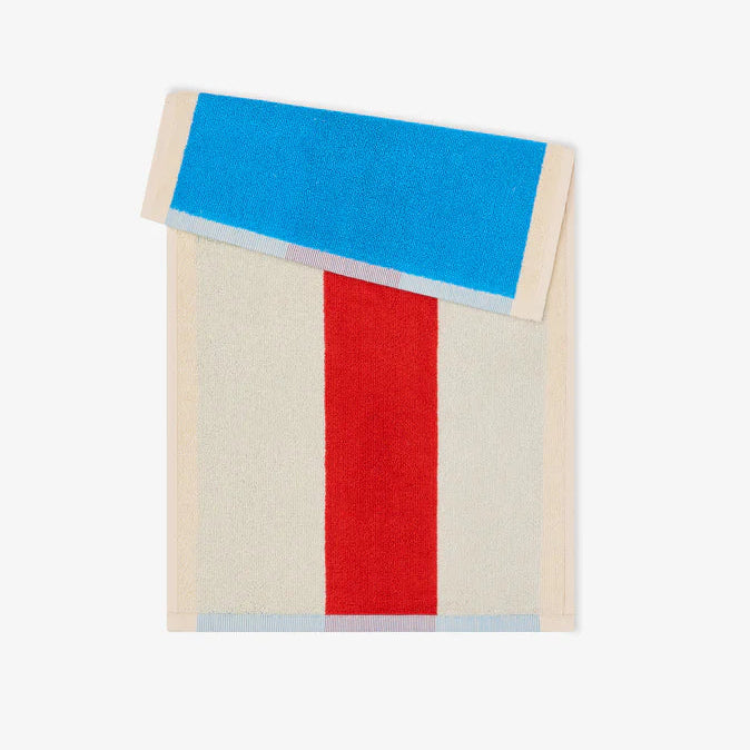 Double sided towel with a different coloured block or stripe on each side and a handy hanging loop.