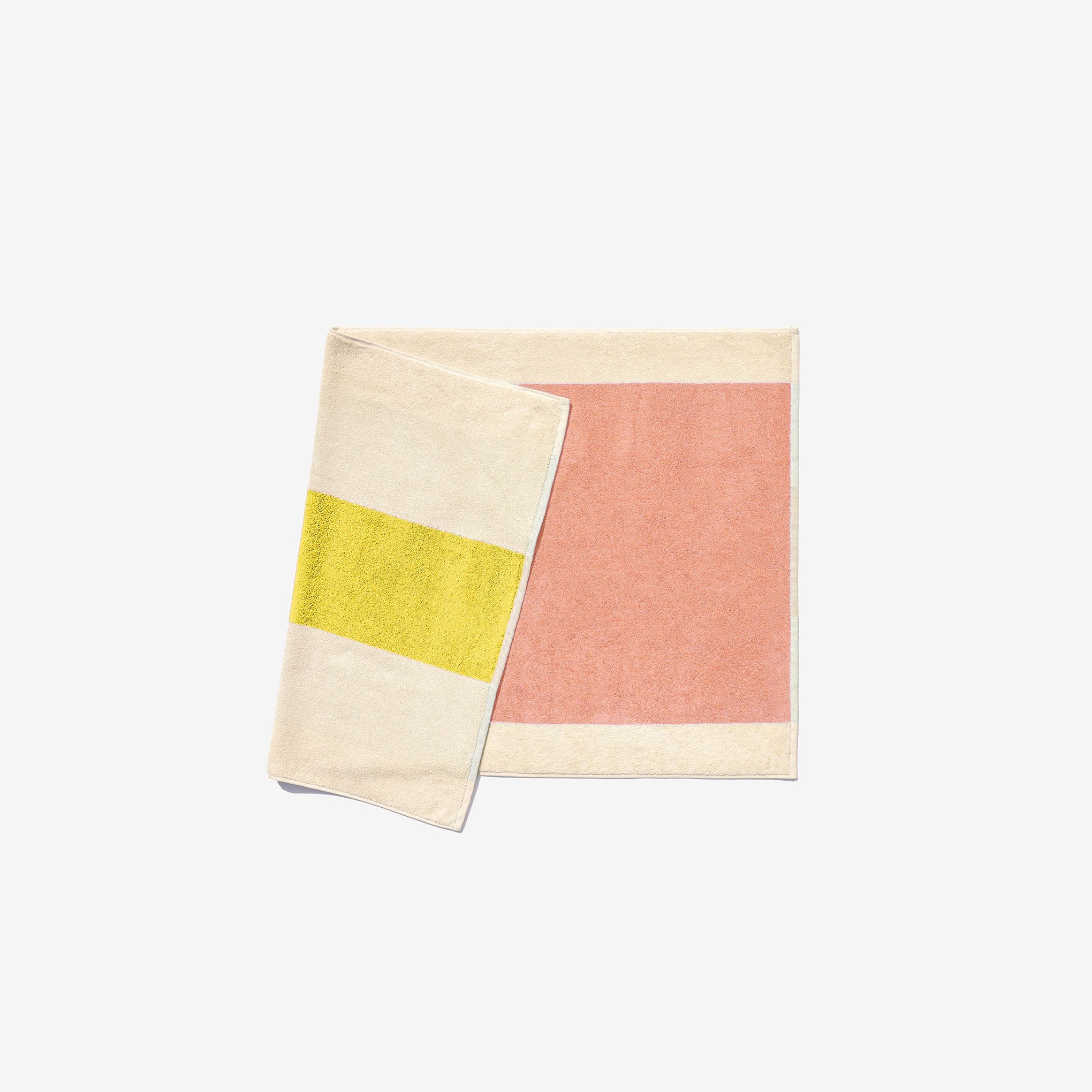 Double sided towel with a different coloured block or stripe on each side and a handy hanging loop.