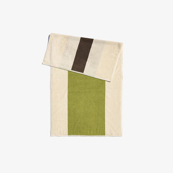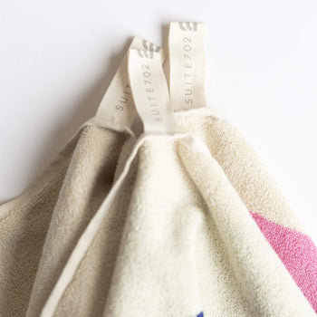 Double sided towel with a different coloured block or stripe on each side and a handy hanging loop.
