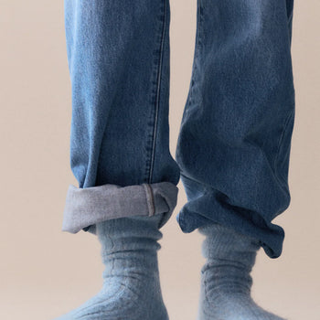 These soft, blue bed socks are the ultimate in luxury loungewear, yet are robust enough to be used in place of slippers.