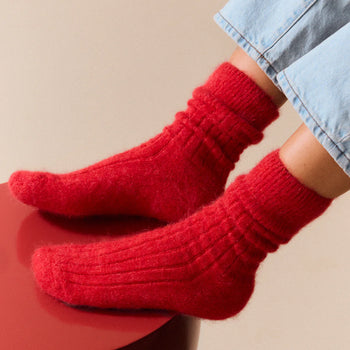 These soft, bright red bed socks are the ultimate in luxury loungewear, yet are robust enough to be used in place of slippers.