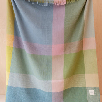 This vibrant TBCo blanket with fringe in a green, blue, pink and yellow block check pattern is the perfect companion for cosy moments.